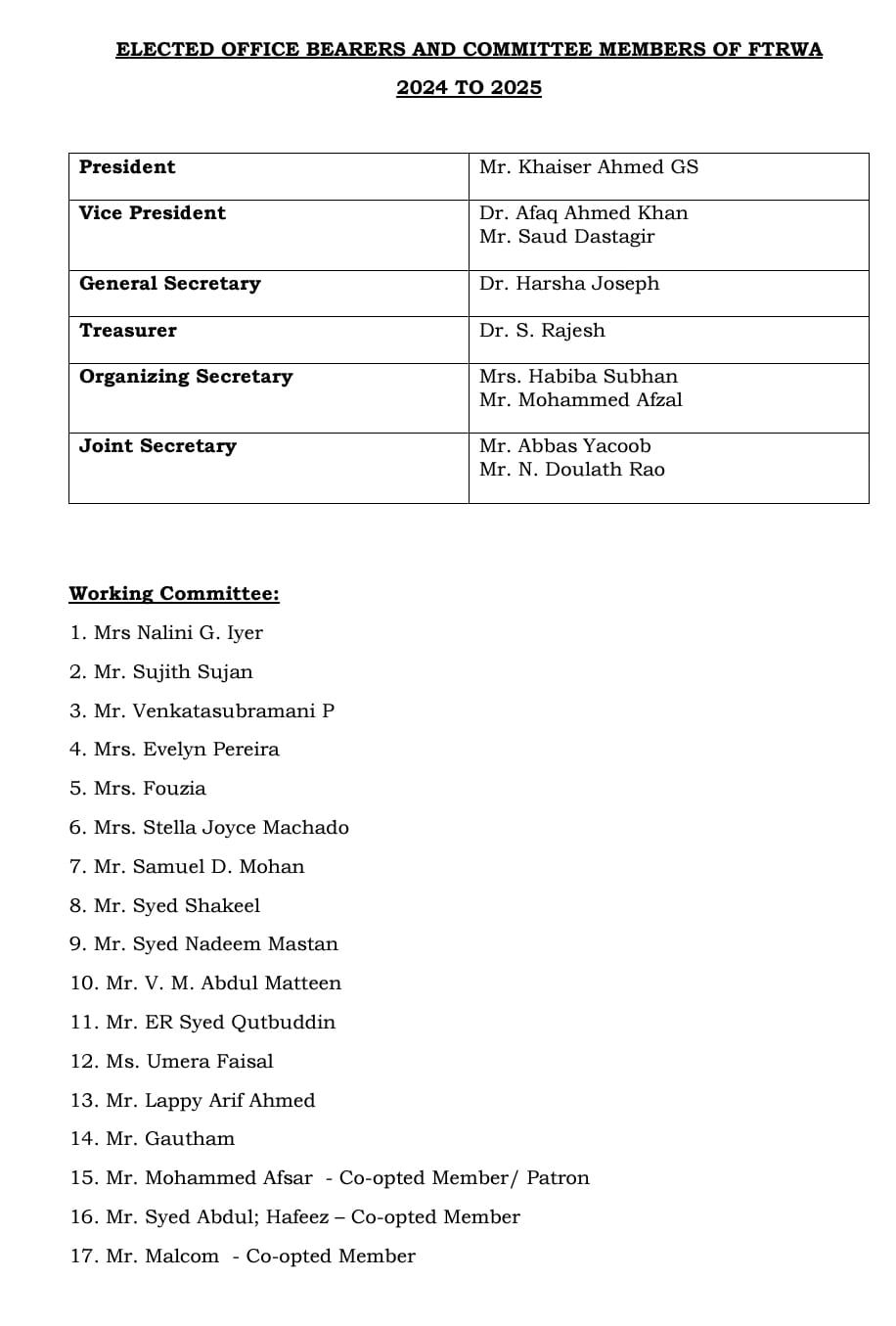 Fraser Town Residents Welfare Association (Regd.) No. 15, Ahmed Sait Road, Fraser Town Bengaluru 560005. INDIA